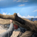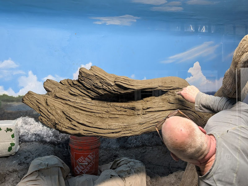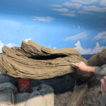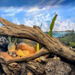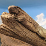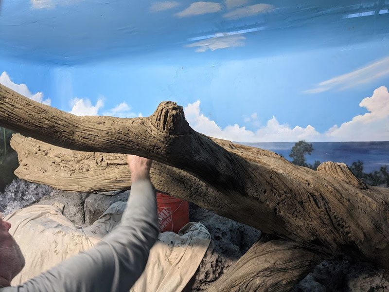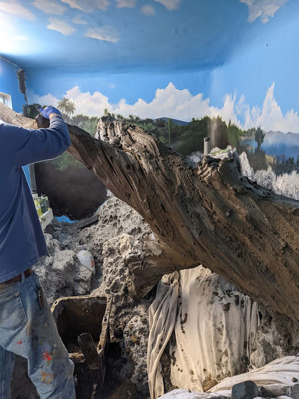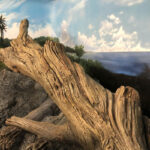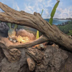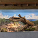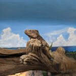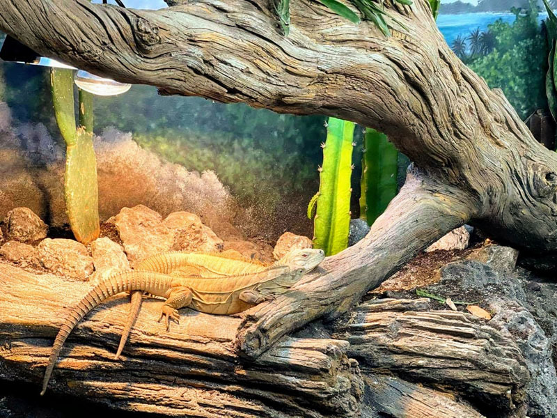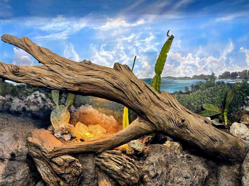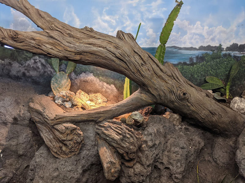 This iguana ( Cyclura ricordii) exhibit was commissioned by a private collector. They wanted everything to have the look and feel of the ricordii’s natural environment, the island of Hispaniola. Hispaniola features beaches of jagged rock, driftwood, palms, and cacti, all of which we included when making this exhibit. This was a complete turn-key exhibit, we did everything from the rockwork to the mural, the heat lamp installation to the sculpted concrete log.
