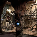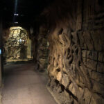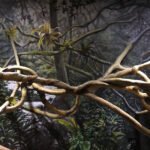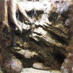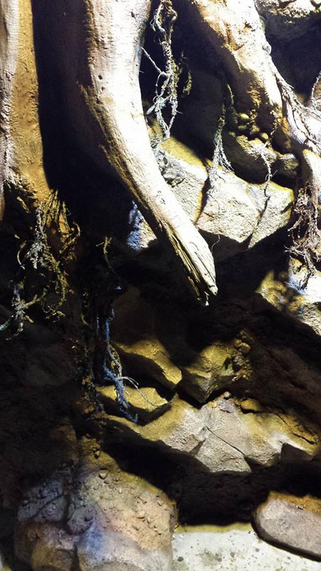 Being arboreal, these guys need to be able to safely climb, so there are lots of sturdy vines (which are strong enough to hold a zookeeper), along with crumbling columns that have hollows built into them to serve as hiding and sleeping spots for the animals. The walls are concrete sculpted to look like an old block wall. A common problem with animal exhibits is how to disguise keeper access doors so they don’t take from the aesthetics of the exhibit. We airbrush painted a mural so that instead of seeing a door, you see the floor and block wall continue on into a darkened area. This exhibit has a common wall of glass with the bat exhibit. Various items left behind from the archaeological site were cut in half and put back together but on opposite sides of the glass, making it appear as though the area is open.