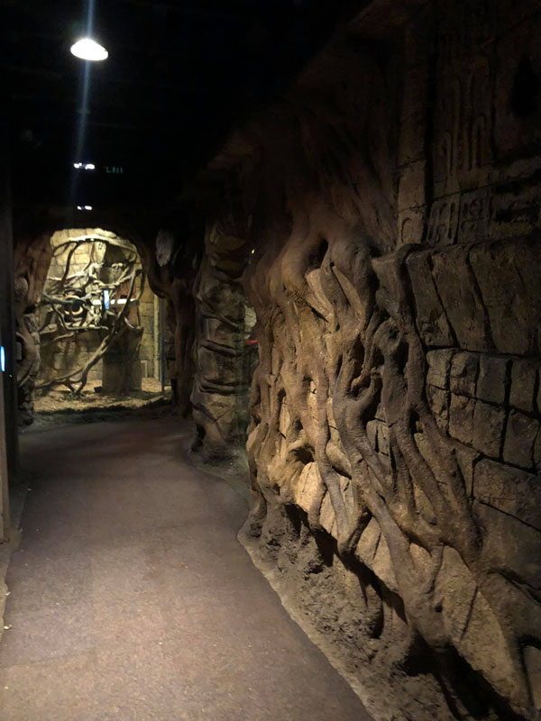The U shaped guest area is themed with sculpted block walls, which transition into smaller blocks and designs. We sculpted not in straight lines, but in a realistic way with some blocks crumbling and vines overtaking much of it. This allows the viewing glass to appear as a natural peek into the lives of the animals. The theming continues onto the floor to avoid any unnatural 90 degree angles. The inside bottom of the U got an extra boost with faces of deities and esoteric symbols carved into the blocks.