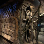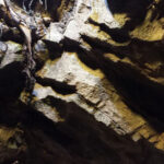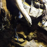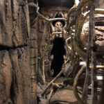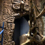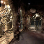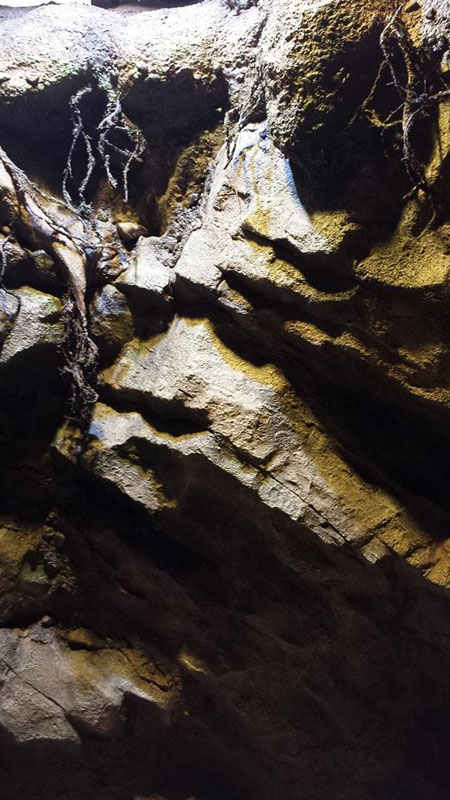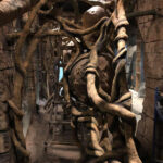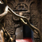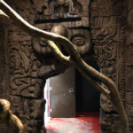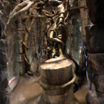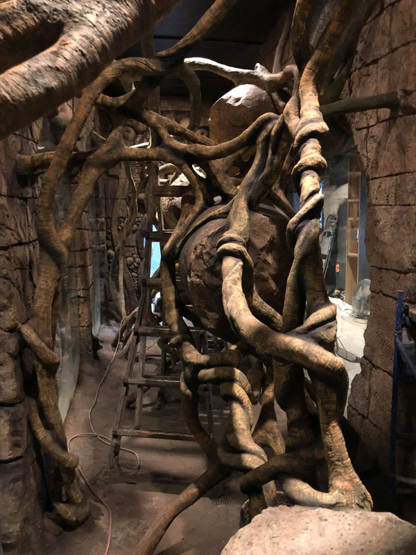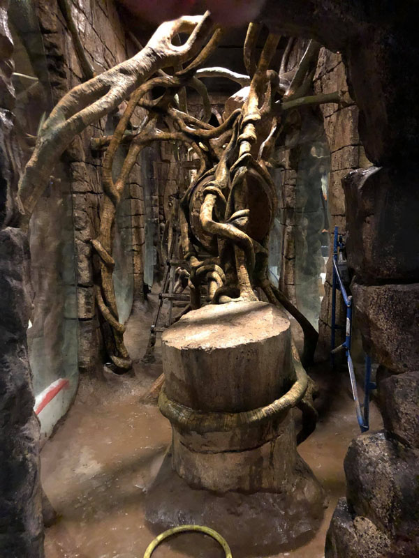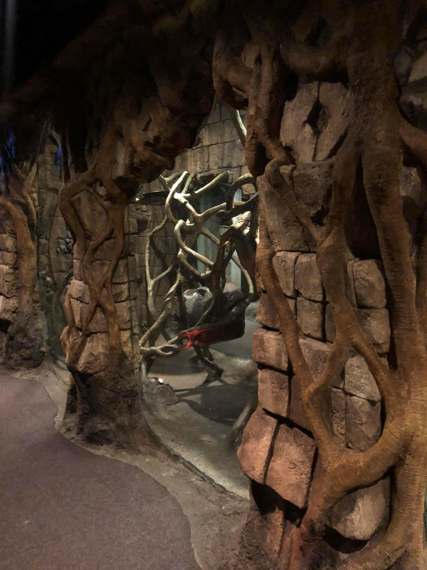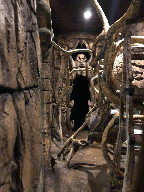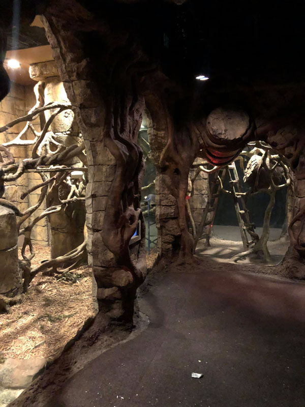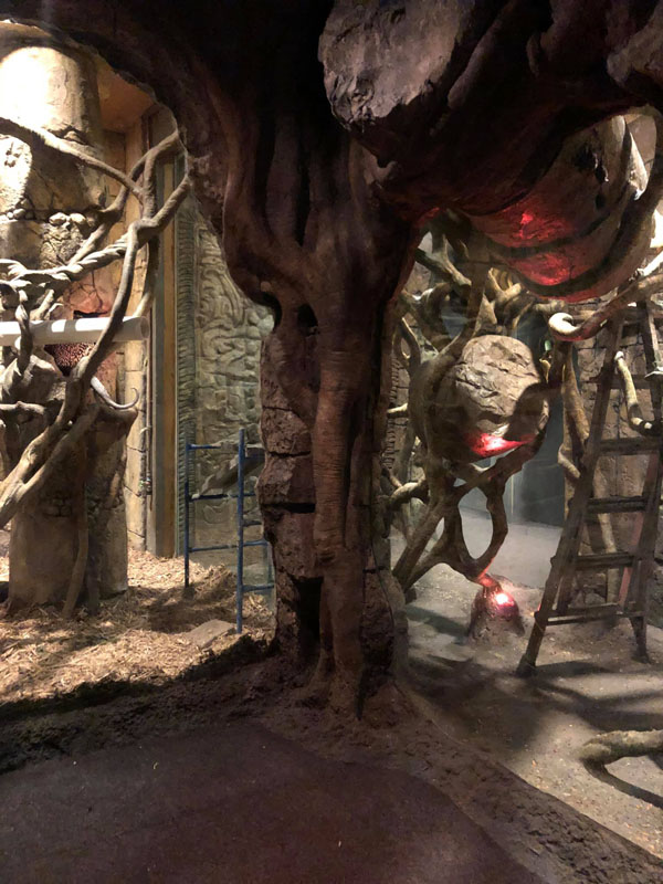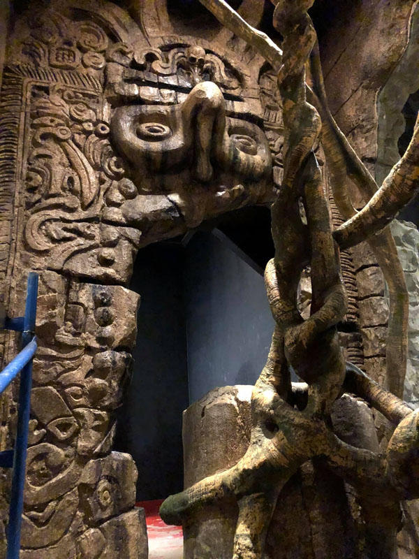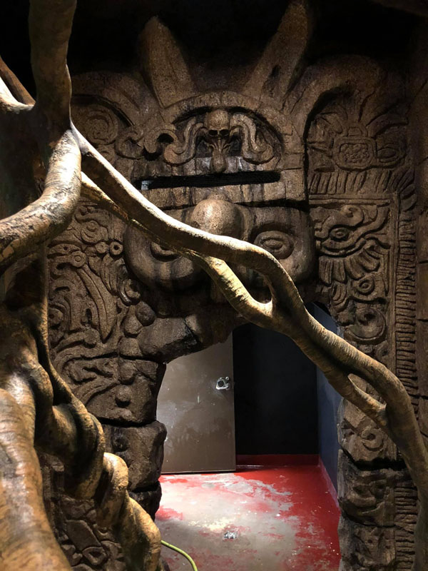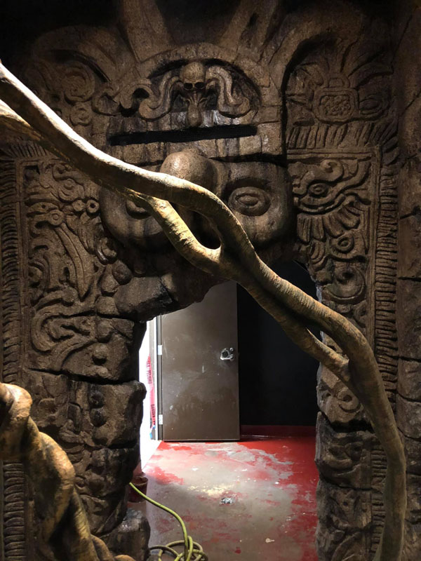 This is the centerpiece of the building. We put our heart and soul into this and are very pleased with the result. The inside walls are sculpted blocks to match the outside guest area hallway. It contains crumbling columns, some of which are in the process of falling over, only to be caught in midair by strong vines. A ladder was “left” in the area and is being overtaken by vines. All vines are concrete and super strong. Each end wall of the exhibit was elaborately hand sculpted. One side is a fictional bat god and the bats fly through its mouth to their roosting area. The other end in a sculpture loosely based on the Mayan storm god; some of it has crumbled and the bats fly through it to a second roosting area. Mist emerges from both of the mouths creating a spooky atmosphere.