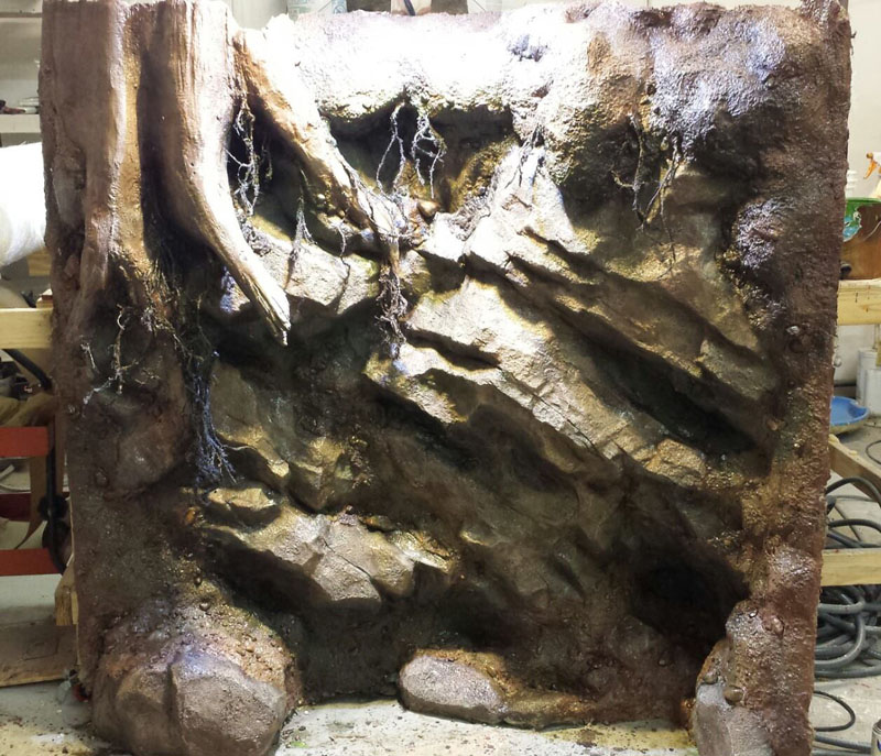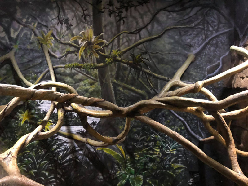 This one has just a bit of sculpted block wall with a shift door for the animals. The majority of the back wall is a large mural depicting a lush jungle with trees, branches, a gorgeous glistening waterfall, and bromeliads that appear to pop right out at you. Sturdy sculpted vines seem to continue straight into the mural.