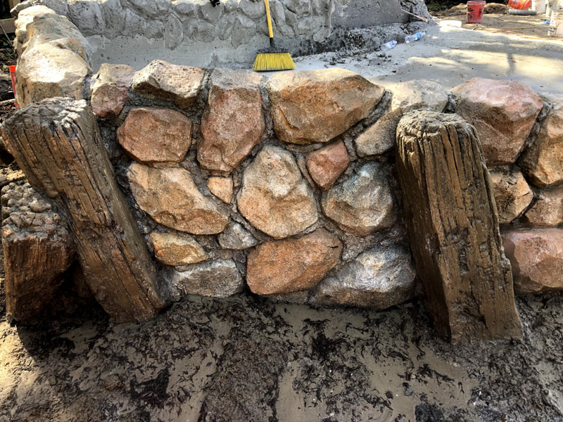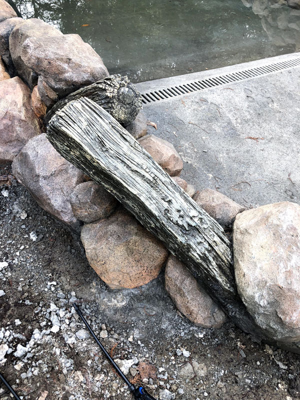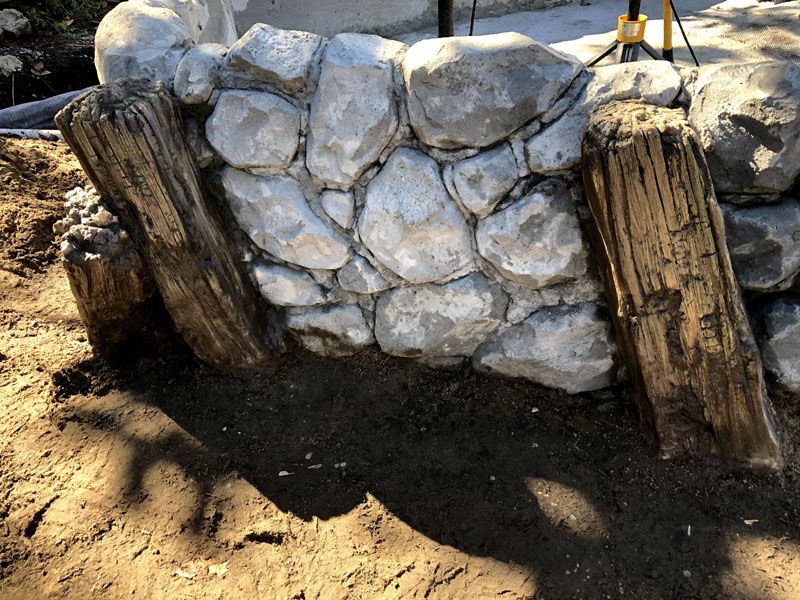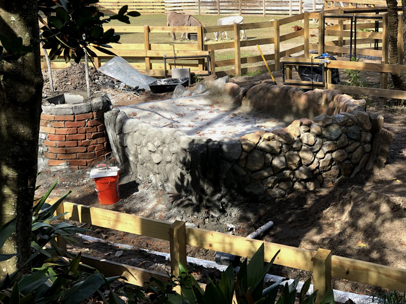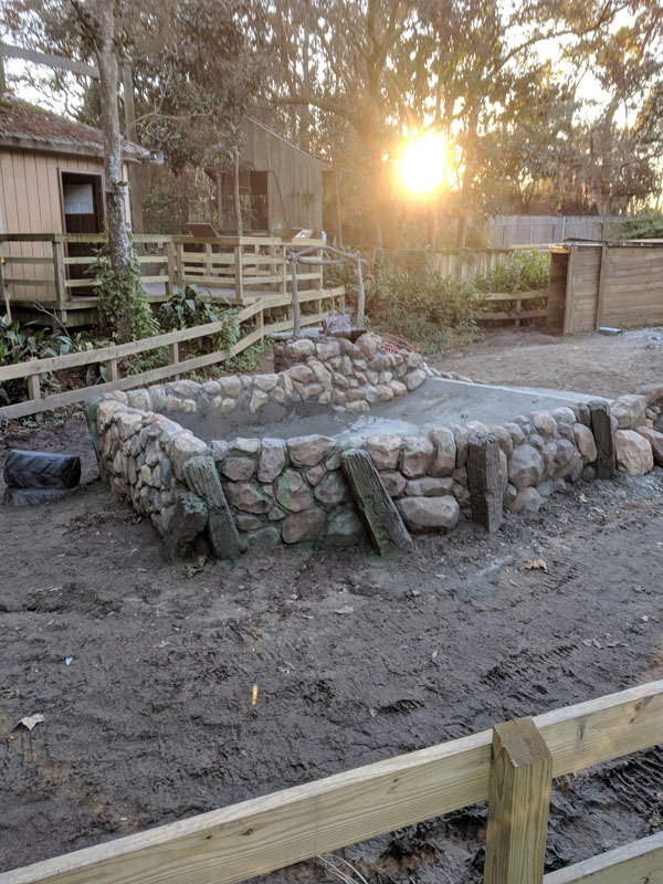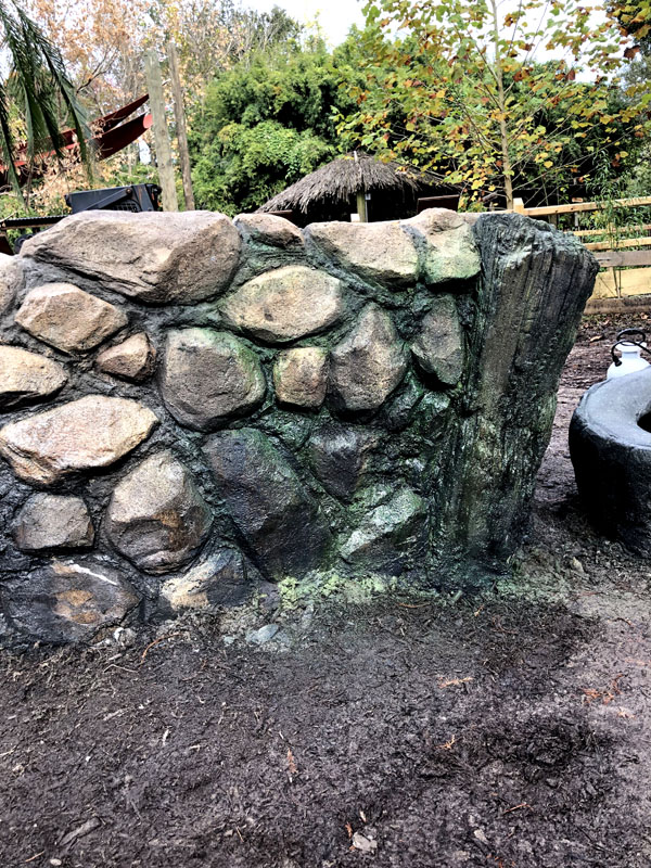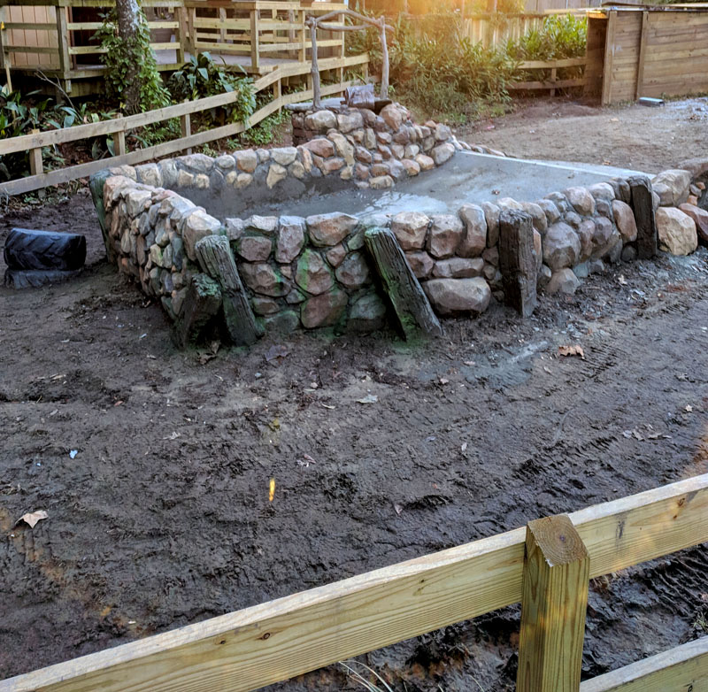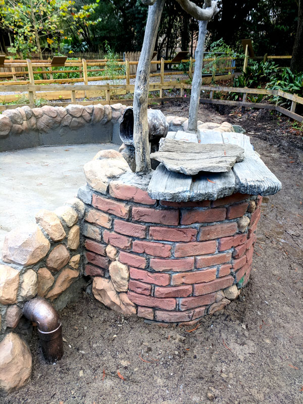 This exhibit is set in a part of a circa 1950s African farm that isn’t in use any longer and has fallen into disrepair. Tortoises have discovered it and moved in. Everything is sculpted of concrete: the sagging rock wall with wood supports, the entire well, the bucket, the tire, everything. The pool is plumbed and can be quickly drained and cleaned.