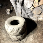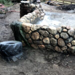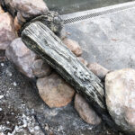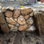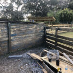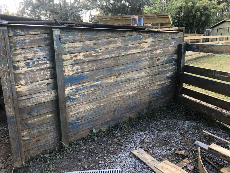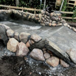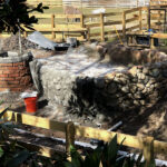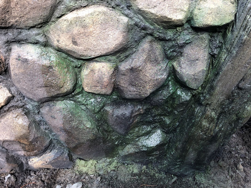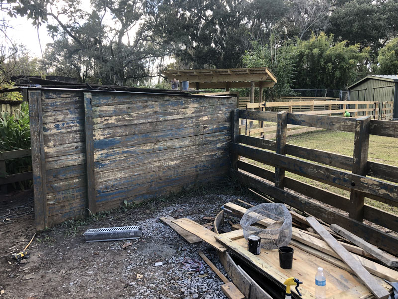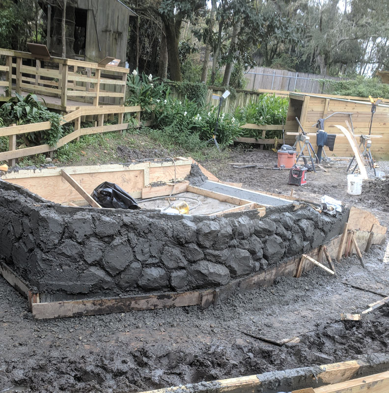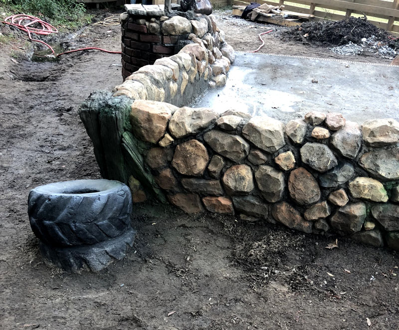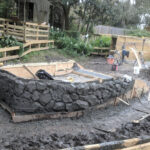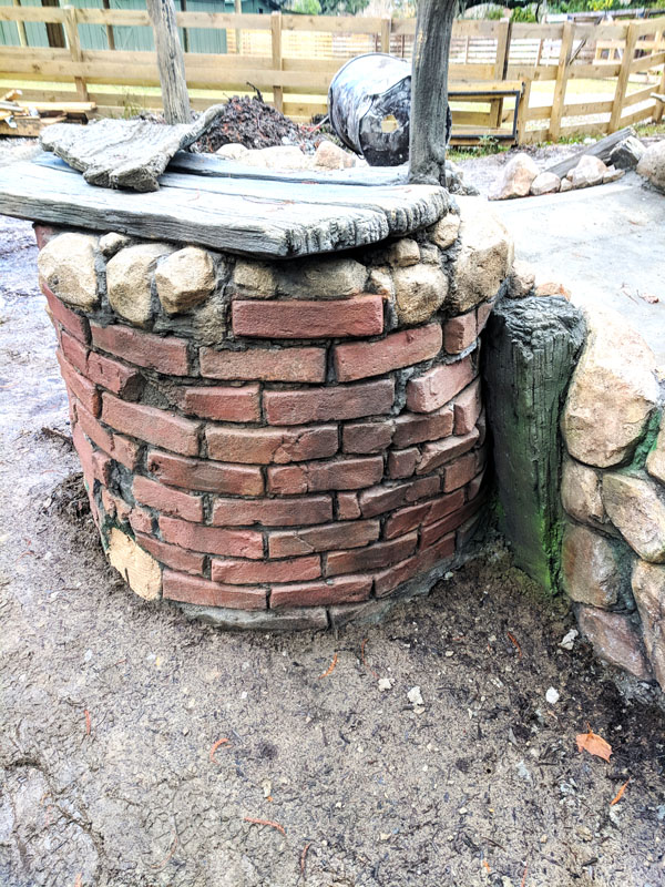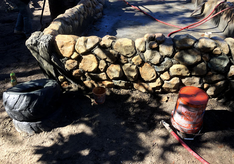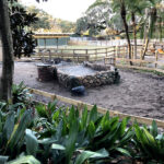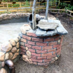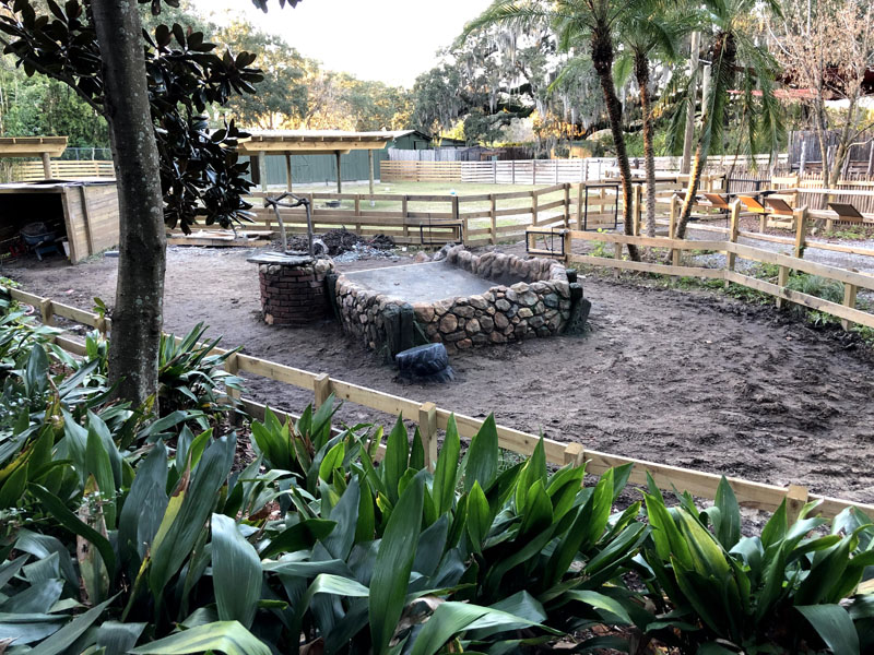 This exhibit is set in a part of a circa 1950s African farm that isn’t in use any longer and has fallen into disrepair. Tortoises have discovered it and moved in. Everything is sculpted of concrete: the sagging rock wall with wood supports, the entire well, the bucket, the tire, everything. The pool is plumbed and can be quickly drained and cleaned.