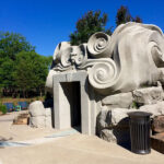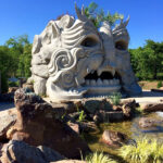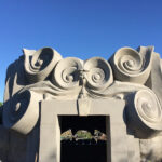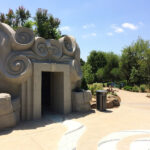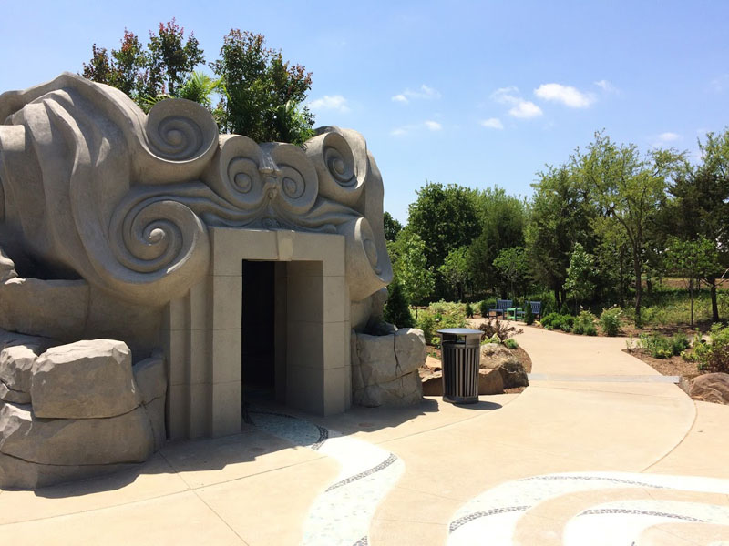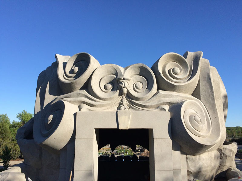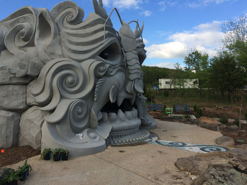 Based on Tulsa Botanic Garden’s design and collaboration with Weber Group, who provided the base structure, we did the shape and texture and sculpted the “Spring Giant” out of concrete. This is by far the most significant sculpture that we have done! It is a massive head with species native to Oklahoma sculpted into the face. We carved volutes into the outside along with rockwork around the perimeter. The rear features a stone mosaic pathway that we laid according to TBG’s design. Inside the giant are bats sculpted into the ceiling and themed alcoves. Standing inside, guests can peer through the giant’s mouth while water pours down from the upper mouth to a pool below the lower teeth. From there, the water flows through the teeth and onto the floor outside. The ceiling contains an oculus (circular opening) and glass and prism film. When the light comes through, it creates a kaleidoscope on the floor below. Bringing this guy to life was challenging at times, but the result was gratifying.